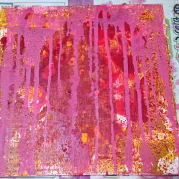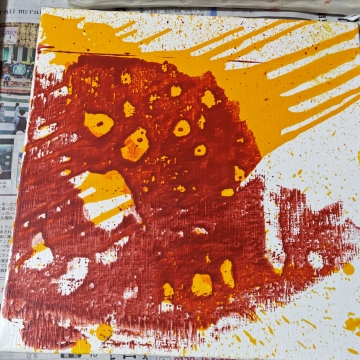油画小作品の下地作りを始めました。キャンバスを張り、キャンゾールを重ねてから、手始めに無造作にドリッ...