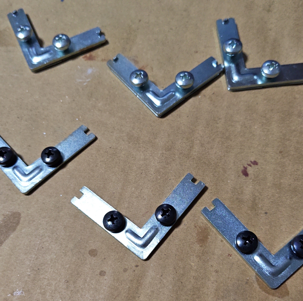 大型キャンバスの仮縁(かりぶち)を組み立てているときに、たくさんの笑顔に見つめられました。あらかわいいの。(仮縁の4つの角を固定する留め具です。)