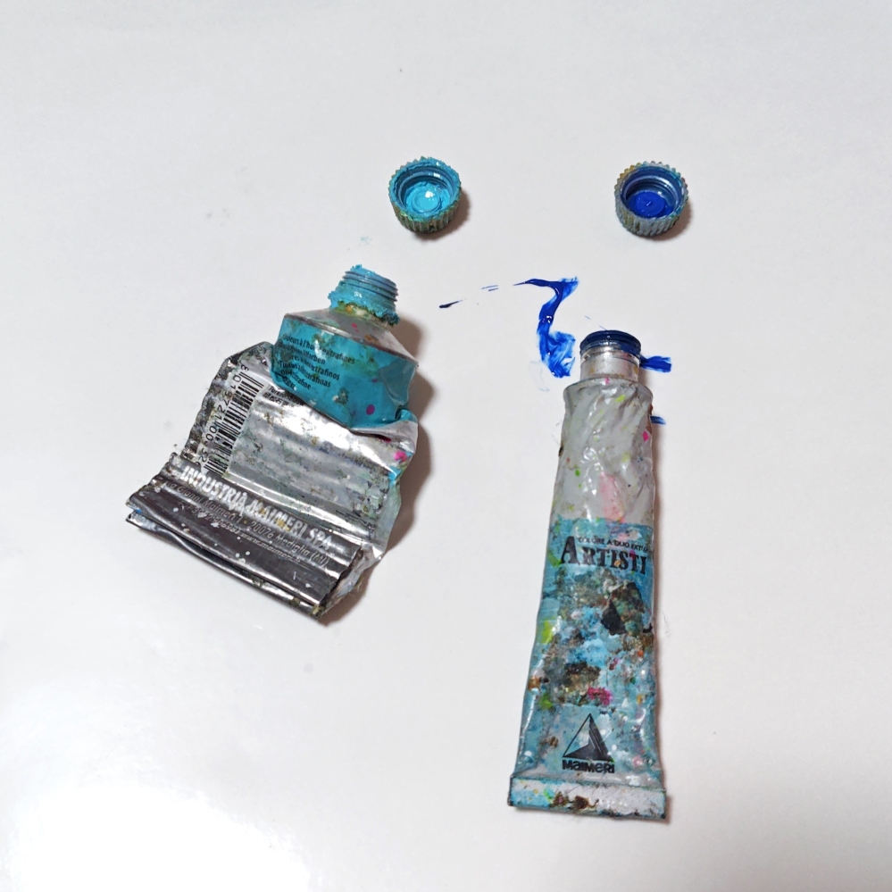 頂き物の絵の具等で普段使わないような絵の具は、よく下地で使います。メーカーが違うようだけど同じ色だと思って、ずっととっておいた右の絵の具。ともにマイメリ。同じようなアンニュイな水色。同じだと信じてました。左がなくなってきたのでさあ使おうと、右の使わな過ぎて固くなった絵の具のふたをこじ開けると、